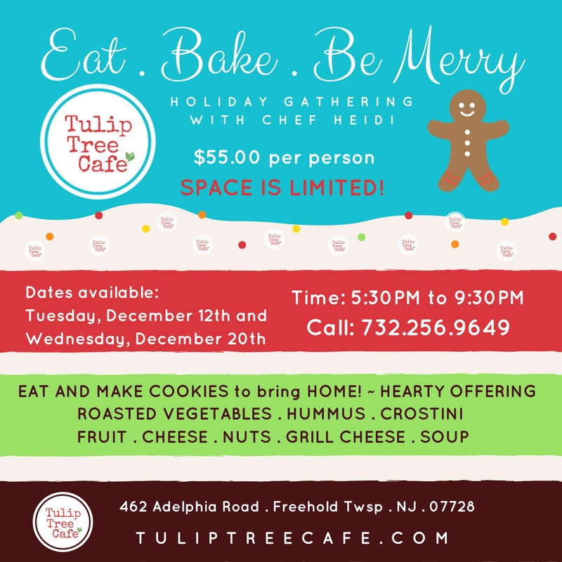 Eat . Bake . Be Merry - with Chef Heidi at Tulip Tree Cafe` - Join in the holiday fun...Eating and baking cookies to bring home!